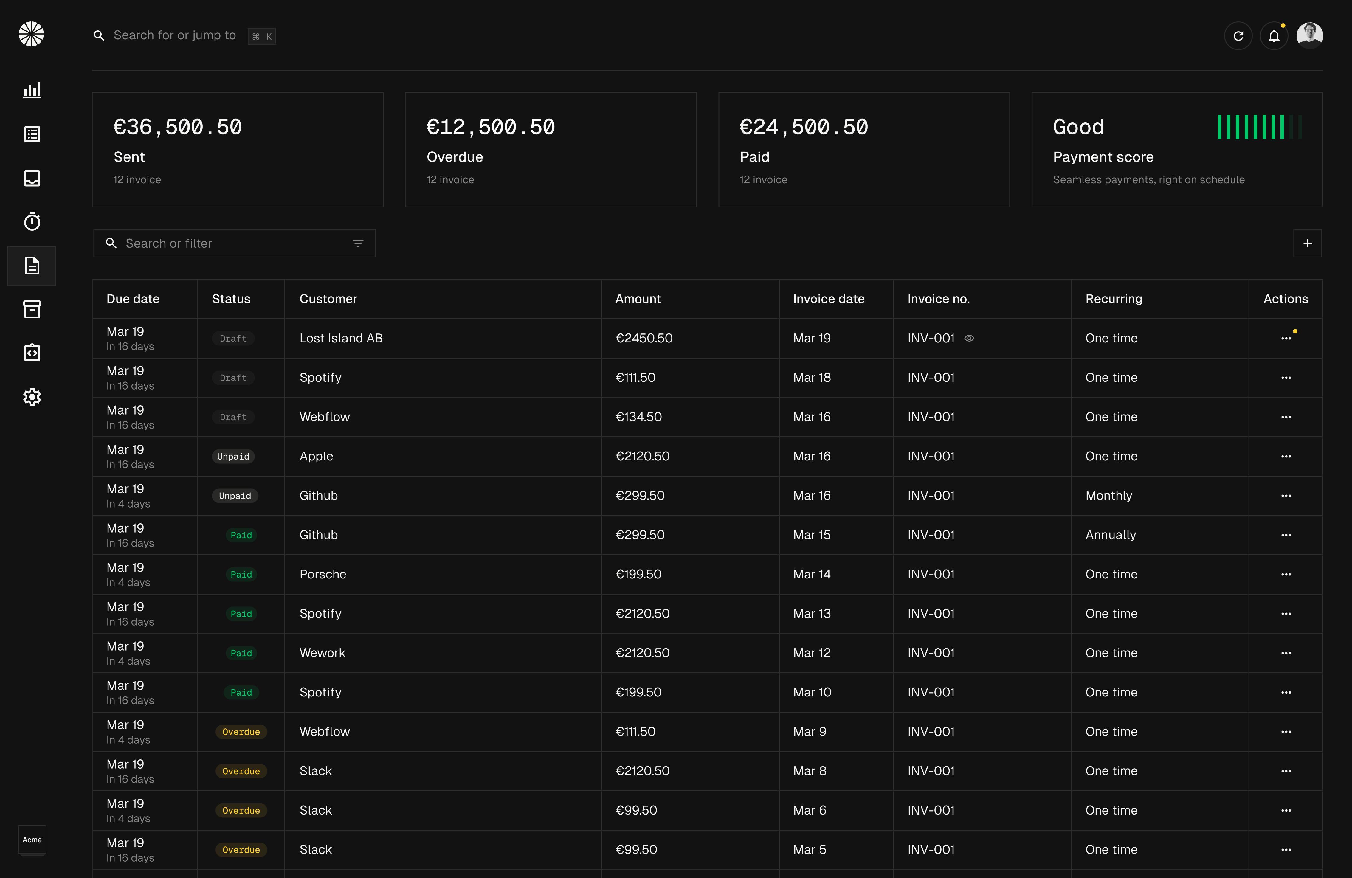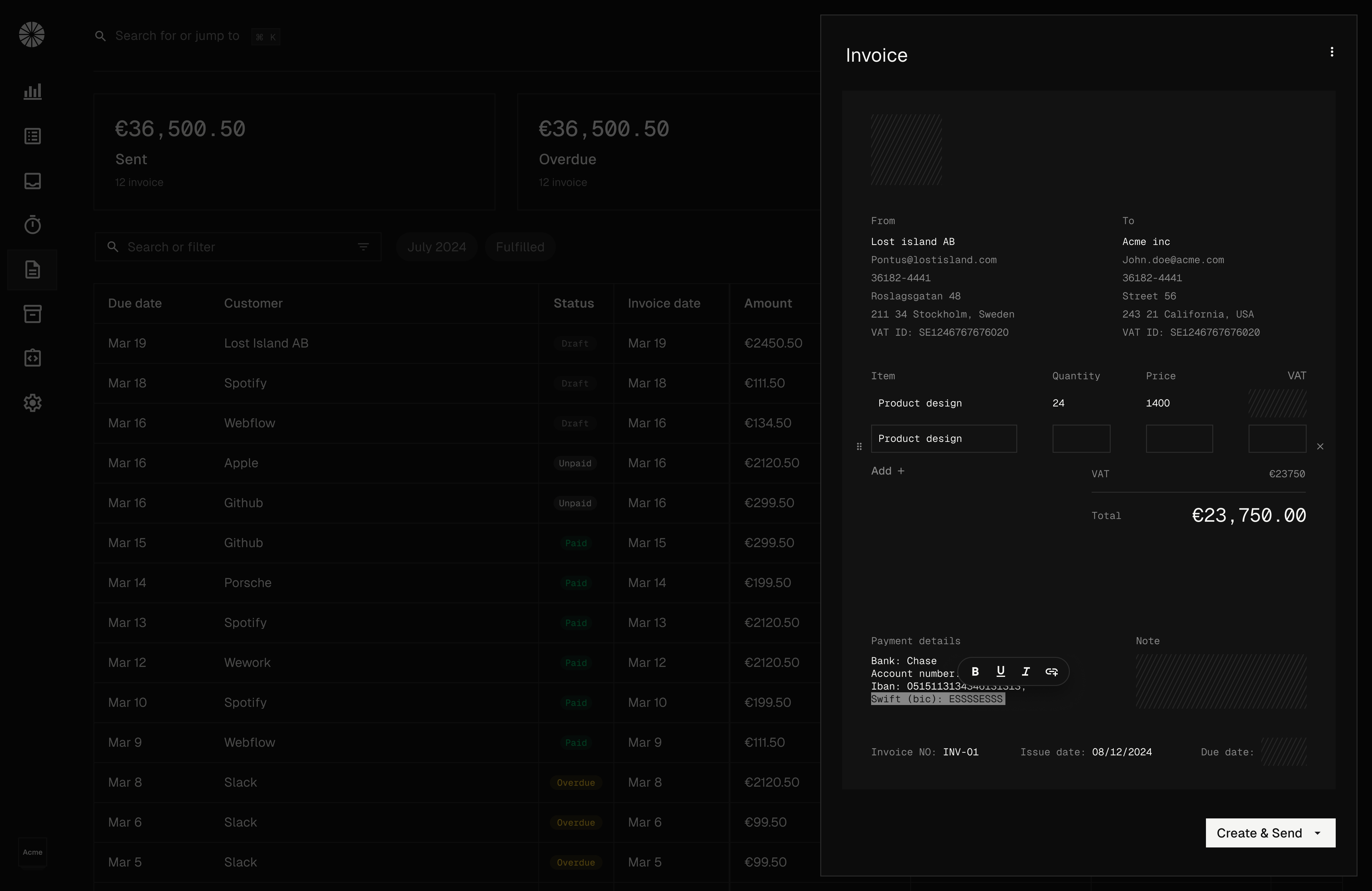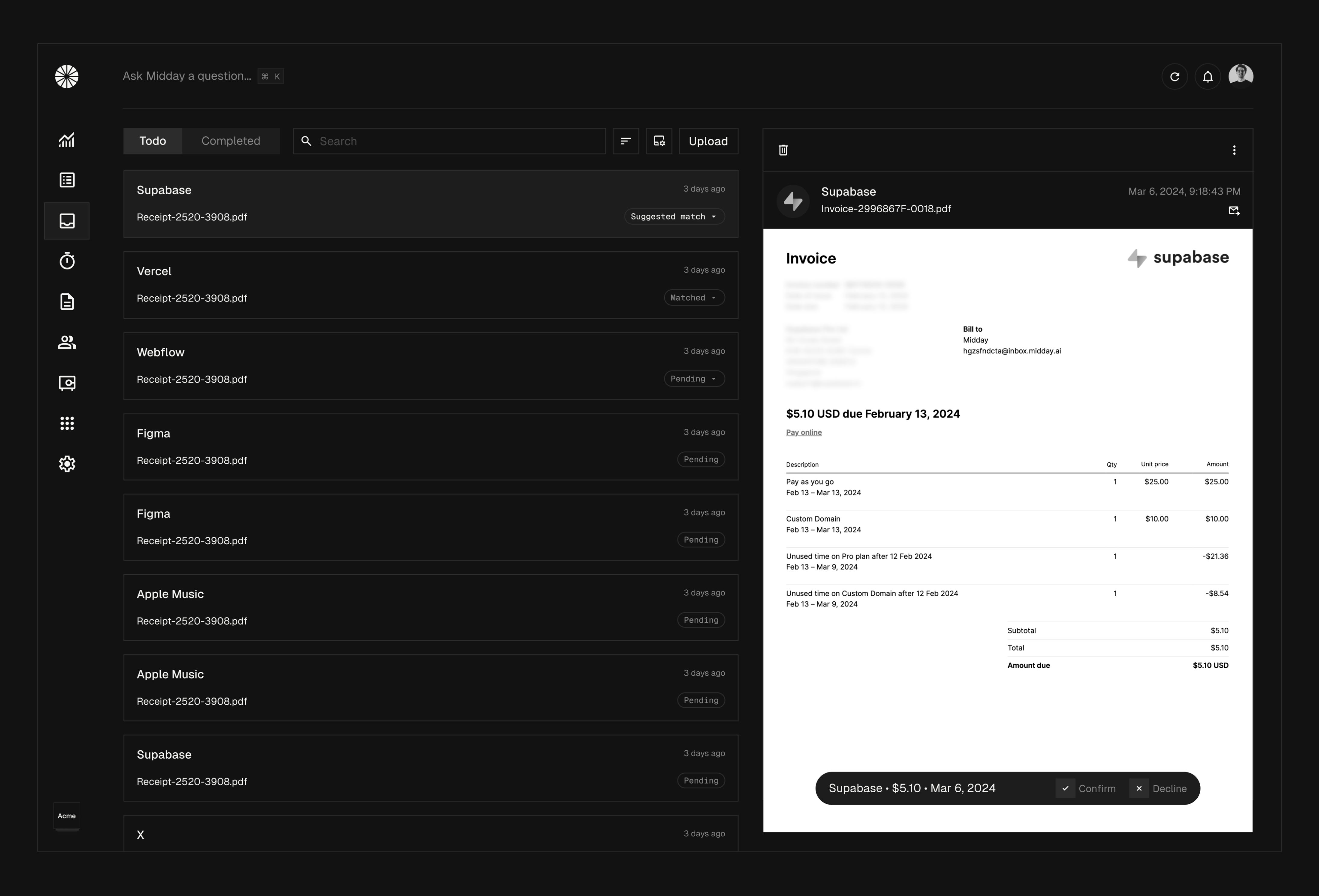 We are building a new experience for invoices in Midday. You'll be able to create and send invoices to your customers, as well as generate PDFs for each invoice.