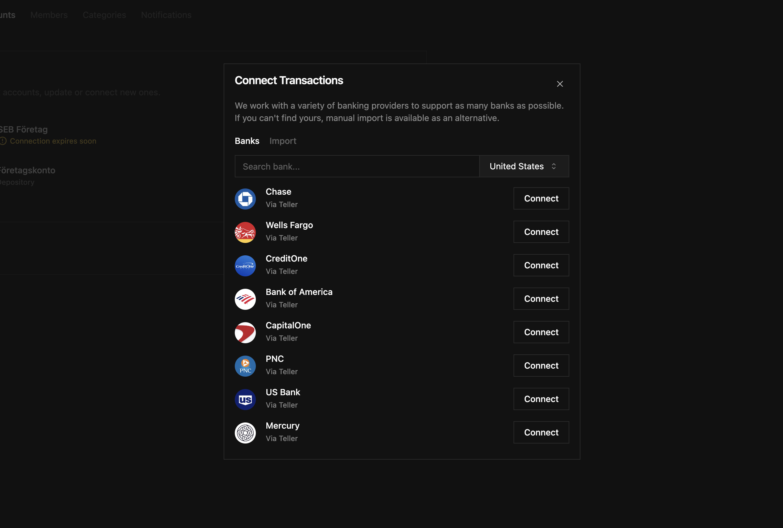 Thanks to our new engine, you can now search for your bank directly. It's much more reliable, and you can view the status of your connection. You can also manually sync your connection in the Settings.